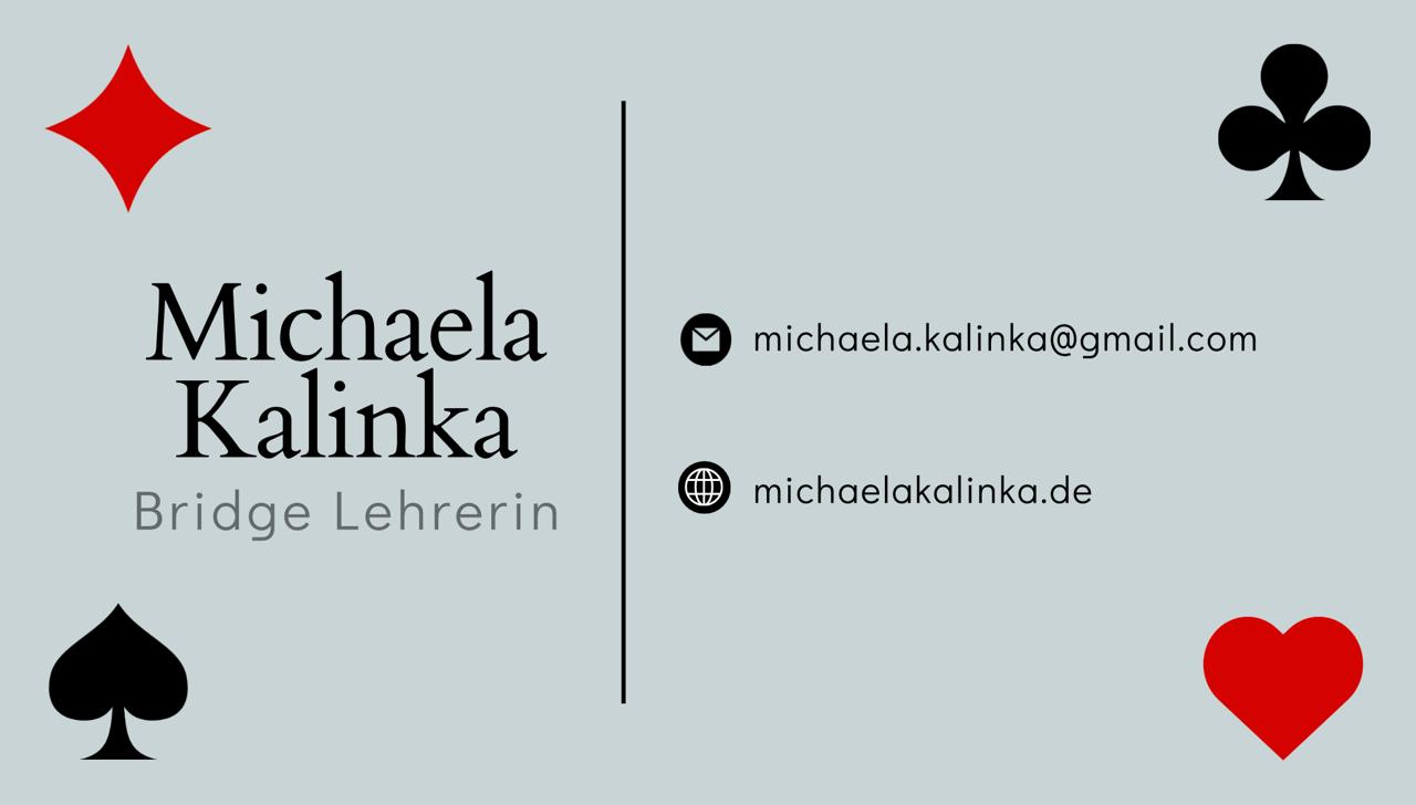 Herzlich willkommen auf meiner Webseite zu Bridge-Kursen in Berlin. Mein Name ist Michaela Kalinka, ich bin leidenschaftliche Bridge-Spielerin und in verschiedenen Berliner Clubs aktiv.
